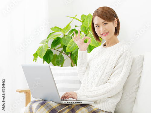 woman, waist up, ok, rejoice, joyful, roger, formation, consent, success, satisfaction, personal computer, notebook, mail, cyberspace, spend, room, living room, indoor, indoor, house, home, lifestyle, japanese, smile, smile, asian, signs, pose, gesture, fx, search, net, game, app, young, pretty, sweet, sweater