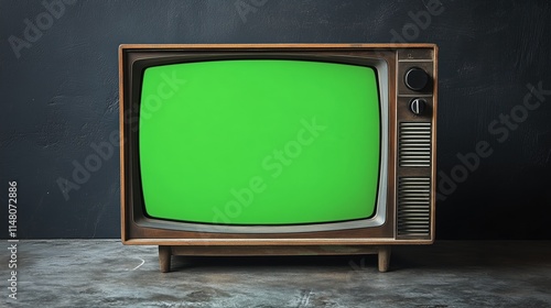 Old analog TV with blank green screen. Concept of old technology or Time of change