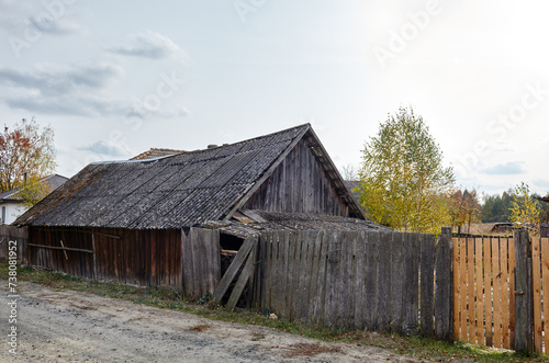 Old barn with wooden fence in countryside. Road in the village, summer rural landscape