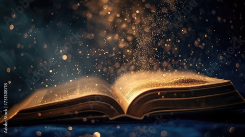Old book opened and light particles on dark bg photo