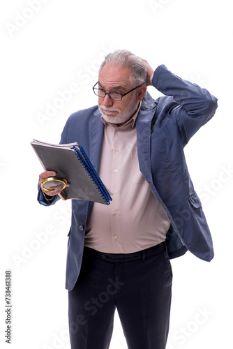 white, isolated, background, man, old, business, businessman, reading, paper, document, contract, agreements, looking, glasses, magnifying glass, magnifying, magnifier, auditing, investigating, investigator, auditor, inspecting, fraud, investigation, holding, pile, paper, document, report, paperwork, reporting, working, workaholic, workload, report, boss, employee, manager, lawyer, accountant, analyst, adviser, assistant, thinking, concerned, focused, concentrated, concentration