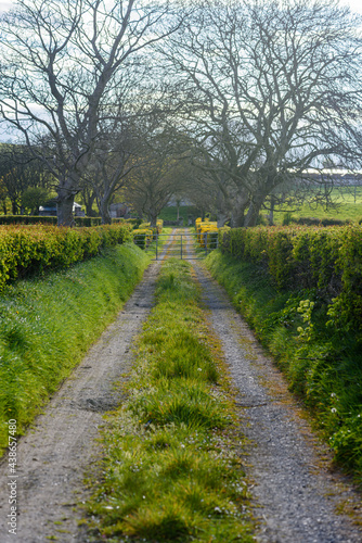 Old farm lane in Northern Ireland with tyre tracks and grass growing in the middle.
