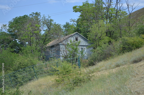 house, landscape, old, nature, country, sky, grass, barn, village, summer, rural, wood, cabin, green, building, wooden, mountain, bungalow, forest, field, tree, tree, farm, home, abandoned