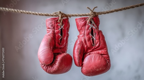 Old red boxing gloves dangle from a rope showcasing their worn texture and charm.