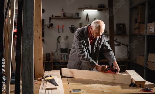 Old retired carpenter planing wooden beam working with hand tool in carpentry workshop