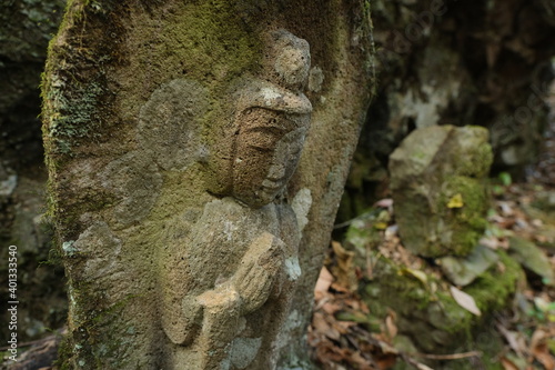 峠のお地蔵様。Old Trail with historical Stone Statue of Buddha. Trekking at mountain area, Japan.