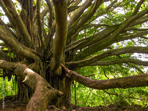 Old tree with multiple branches growing to the ground for support in the rain forest, Maui, Hawaii, USA.