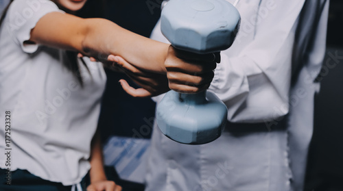 old woman training with physiotherapist using dumbbells at home therapist assisting senior woman with exercises in nursing home elderly patient using dumbbells with outstretched arms no logos no bran