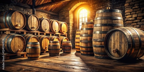 Old wooden barrels with beer labels on a dimly lit brewery cellar, brewery storage, barrel aged beer, brewery equipment, old wood barrel