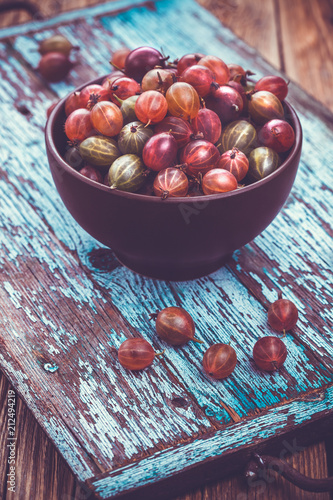 old wooden tray with gooseberry on the table
