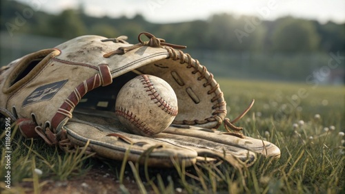 Old, worn baseball glove lies on the grass of a baseball field, gently cradling a well used baseball, evoking a sense of nostalgia and memories of past games