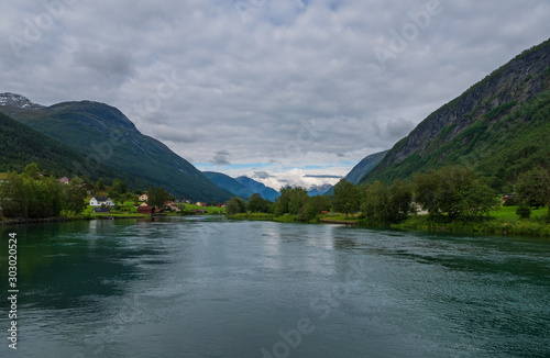 Oldedalen valley - one of the most spectacular areas of natural beauty in Norway. Town Stryn and river Strynselva. July 2019
