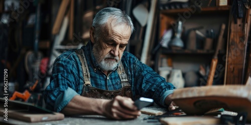 older, man, senior, wood, carving, craft, carpenter's shop, hand-made, artisanal, manual labor, elderly, retirement, hobby, avocation, creative, artsy, rustic, natural, bricolage, home improvement, age, maturity