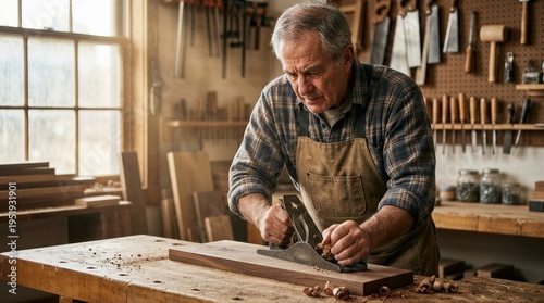 man, carpenter's shop, carpenter, craftsman, workshop, apron, tool, wood, craftsmanship, wooden board, focused, indoor, hobby, repair, construction, skill, labor, professional, carpenter's shop, creative, craft, hand tool, woodworker, adult, male, people, activity, lifestyle