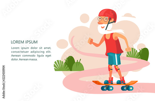 Older people lead an active lifestyle. Old people play sports. Grandfather is a skateboarder. Vector illustration.