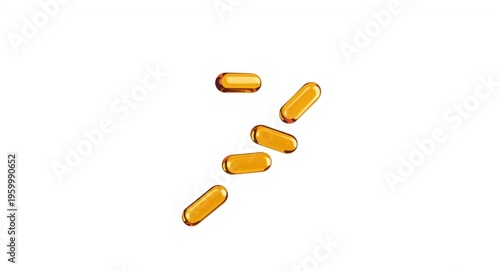 Omega 3 supplement softgels gently drifting in front of a white background