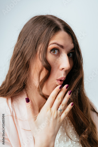 on a gray background young girl covers her mouth in shock hand