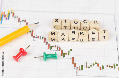 On the charts with quotes are a pencil and cubes with the inscription - Stock market