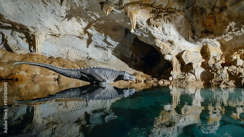 On the surface of a cave a gray dinosaur statue floats on an antique the ordinary