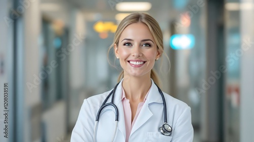 Oncologist Standing Confidently in a Bright Hospital Corridor with a Stethoscope (Healthcare)