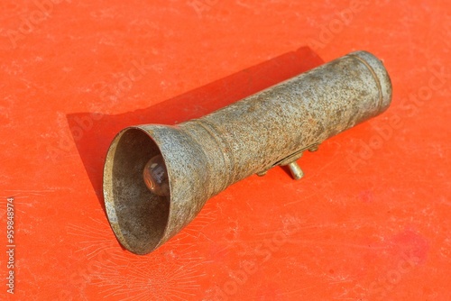 battery, broken, bulb, buttons, classic, colours, decor, design, electric, electricity, flashlight, glasses, grey, history, illumination, iron, lamp, lie, light, metal, metallic, night, object, old, 1, pocket, portable, power, red, reflector, retro, round, small, steel, switch, table, technology, toggle, tool, traditional, vintage, work