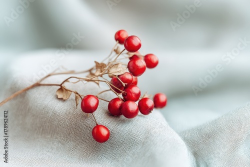 One Red Berry Branch on Light Fabric Shallow Depth of Field Soft Pastel Tones Minimal Nature Photography