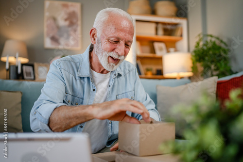 man, senior, open, present, box, read, gift card, card, grandfather, birthday, gift box, online, laptop, computer, modern, alone, happy, smile, to sit, home, holiday, gift, christmas, caucasian, table, celebrate, taking, greeting card, separation, retirement home, old man, one person, sentimental, sitting, package, grey hair, leisure, lifestyle, christmas card, congratulation, smiling, new year, thankful, retired, greeting, aged, reading