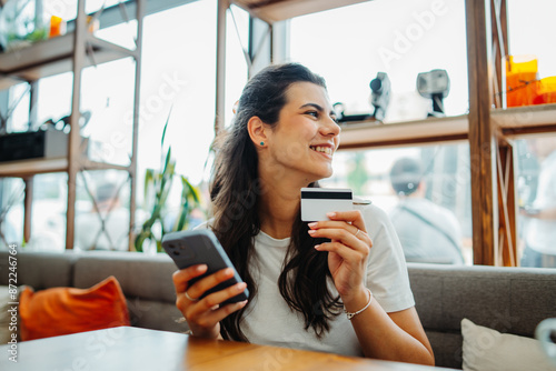 One young beautiful caucasian woman is buying online paying with credit card on mobile phone in cafe during the day