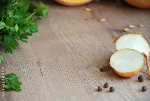 onions, spices and herbs on the table