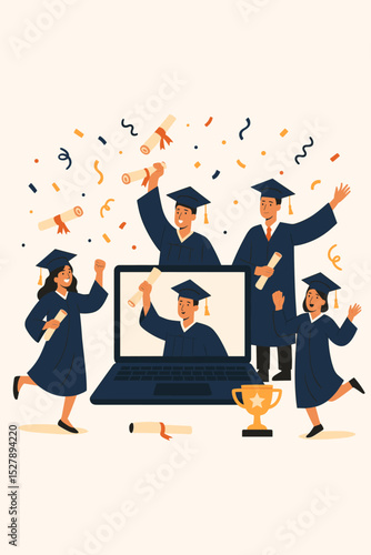 Online graduation ceremony concept. Happy students celebrating virtual graduation day via video call on laptop. E-learning success. Graduates in gowns with diplomas. Vector.