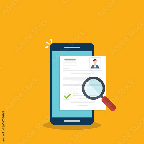 Online resume analysis, use phone and magnifying glass to view recruitment resume, concept of recruitment and human resources