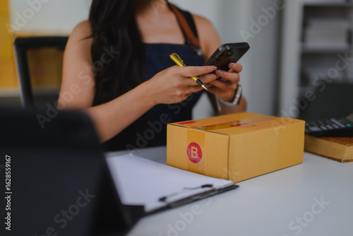 online, seller, commerce, shipping, delivery, small, business, entrepreneur, startup, mobile, phone, smartphone, technology, cardboard, box, package, order, desk, office, store, retail, selling, work, workspace, businesswoman, woman, female, professional, management, logistic, supply, chain, client, service, sale, marketing, communication, cyberspace, website, shopping, digital, parcel, mail, postal, transportation, distribution
