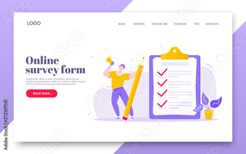 Online survey form business concept with tiny person with megaphone, pencil nearby giant clipboard complete checklist and check mark ticks flat style design vector illustration landing page template.