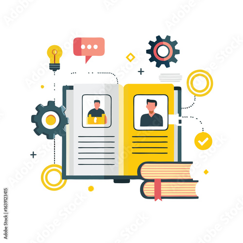 book, open book, learning, education, business, teamwork, collaboration, innovation, idea, concept, illustration, graphic, design, profile, people, gear, mechanism, process, strategy, planning, communication, bright, colourful, vector, modern, simple, minimal, icon, symbol, cognition, understanding, growth, development, success, achievement, progress, solution, creativity, inspiration, wisdom, expertise, skill, talent, potential