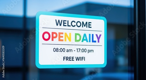 Open Daily Sign on Glass Door Indicating Business Hours and Free WiFi Access