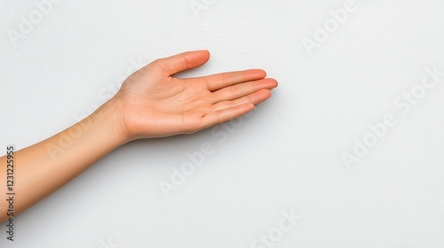 Open Hand Gesture Against Clean White Background: Simple, Minimalist Studio Shot of Outstretched Palm, Offering or Invitation