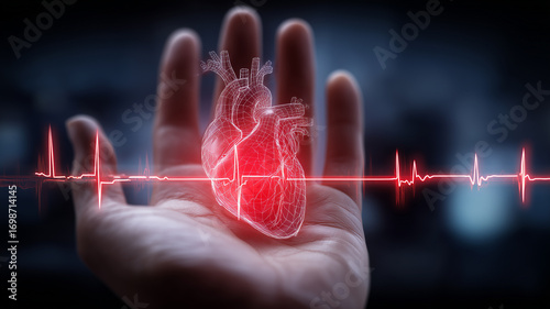 Open hand with digital heart and heartbeat line across, representing cardiac monitoring, prevention and clinical support.