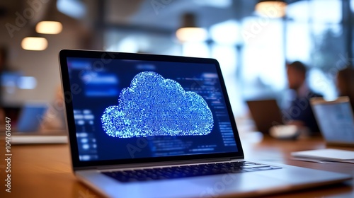Open laptop displaying digital cloud symbol, with a blurred office background.