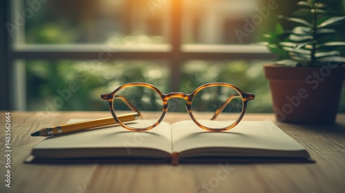 Open notebook with eyeglasses and pencil, peaceful workspace