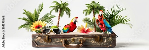 Open retro suitcase with seascape and sand, palm trees and parrots