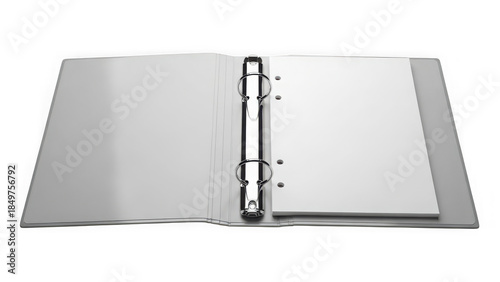 Open three ring binder with blank white paper inside, isolated on transparent background