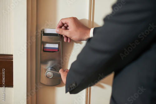 man, male, hotel, working, service, motel, resort, cropped, opening, room, door, entrance, key, electronic, guest, manager, hand, security, protection, unlocking, traveling, access, safety, system