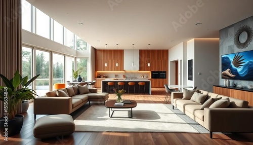 Open-plan modern living room seamlessly flowing into a contemporary kitchen, granite, open plan