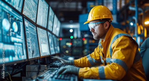 operator, control, room, monitoring, screen, engineer, men at work, factory, automation, plant, industrial, male, young adult, white, protective, eyewear, technology, machinery, professional, engineering, job, occupation, digital, equipment, system, management, technical, workwear, high technology, datum, analysis, operation, work, working, hard hat