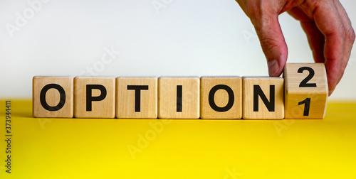 Option 1 or option 2. Hand turns a cube and changes the number '1' to '2' or vice versa. Word option on wooden cubes. Beautiful yellow table, white background. Business concept. Copy space.