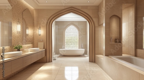 modern, arabian, islamic, interior, design, digital, artwork, render, bathroom, elegant, fixture, decorative, tile, serene, atmosphere, opulent, oasis, luxurious, detailed, intricate, relaxation, exotic, pattern, inviting, middle, eastern, influence, cultural, fusion, wellness, retreat, tranquil, space, ambience