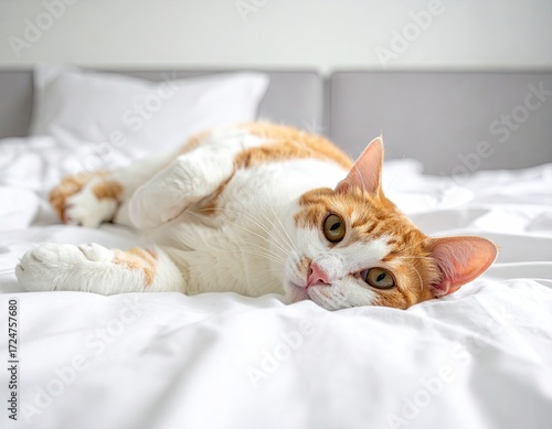 Orange And White Cat Relaxing On White Bedding