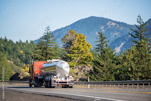 Orange big rig semi truck transporting liquid commercial cargo in tank semi trailer going on winding road with forest on the hill