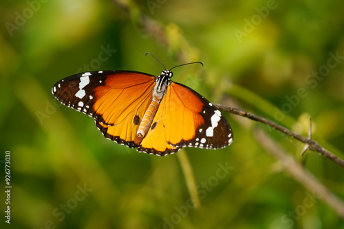 Orange butterfly Danaus chrysippus, also Plain tiger or African queen or African monarch, in Asia, Australia and Africa, consume plants in the genus Asclepias, more commonly called milkweed