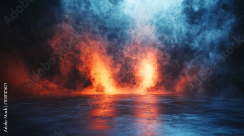 Orange flames and blue smoke on dark background